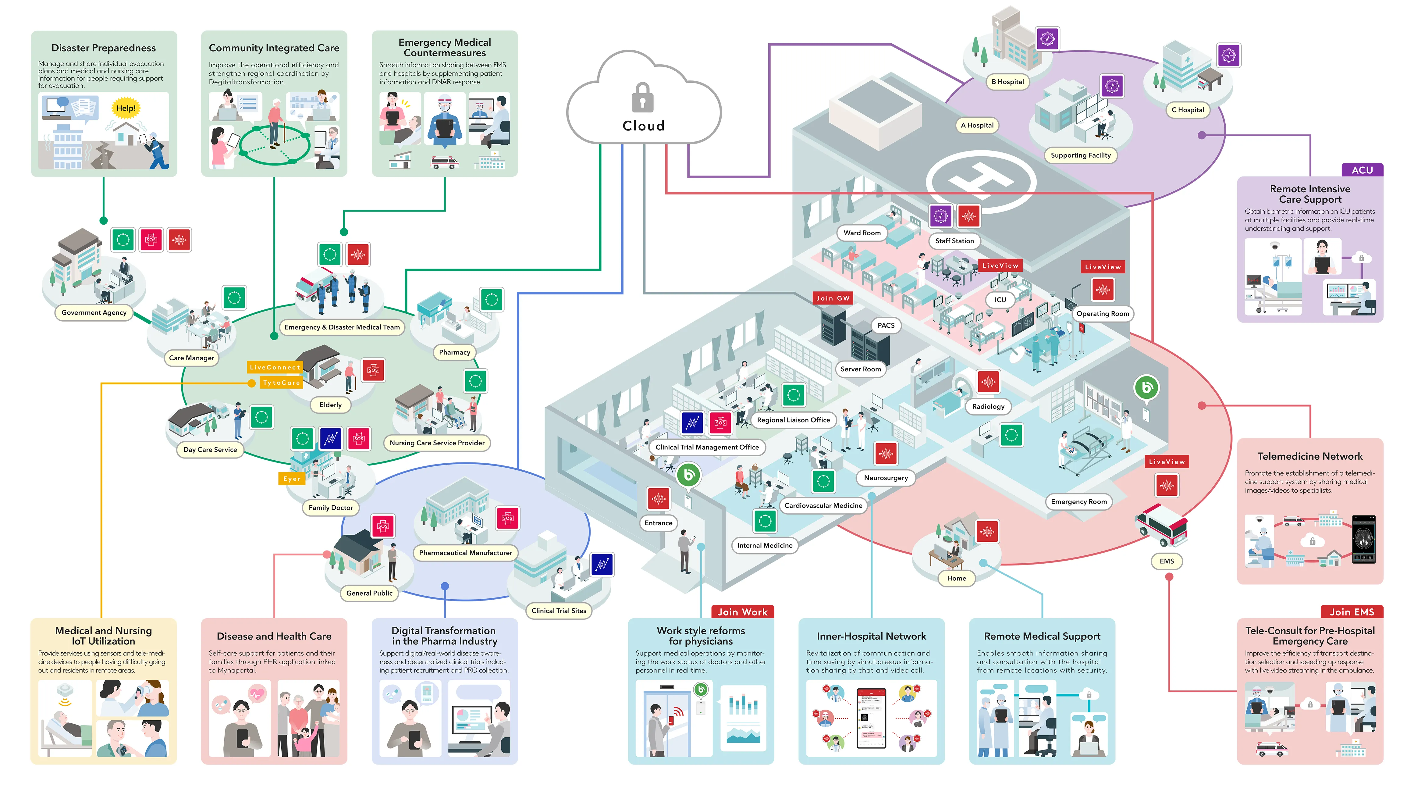 DXing the collaboration of medical and nursing care information among multidisciplinary professions while simultaneously improving the operational efficiency of home care and nursing care by strengthening regional coordination. Accumulated data can also be used for emergency transportation of the patient and disasters, contributing to the creation of communities where residents can live with peace of mind.